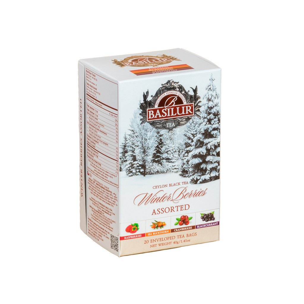 Složení: RASPBERRIES - černý čaj, přírodní aroma (malina), SEA BUCKTHORN - černý čaj, přírodní aroma (rakytník), CRANBERRIES - černý čaj, přírodní aroma (brusinka), BLACKCURRANT - černý čaj, přírodní aroma (černý rybíz)