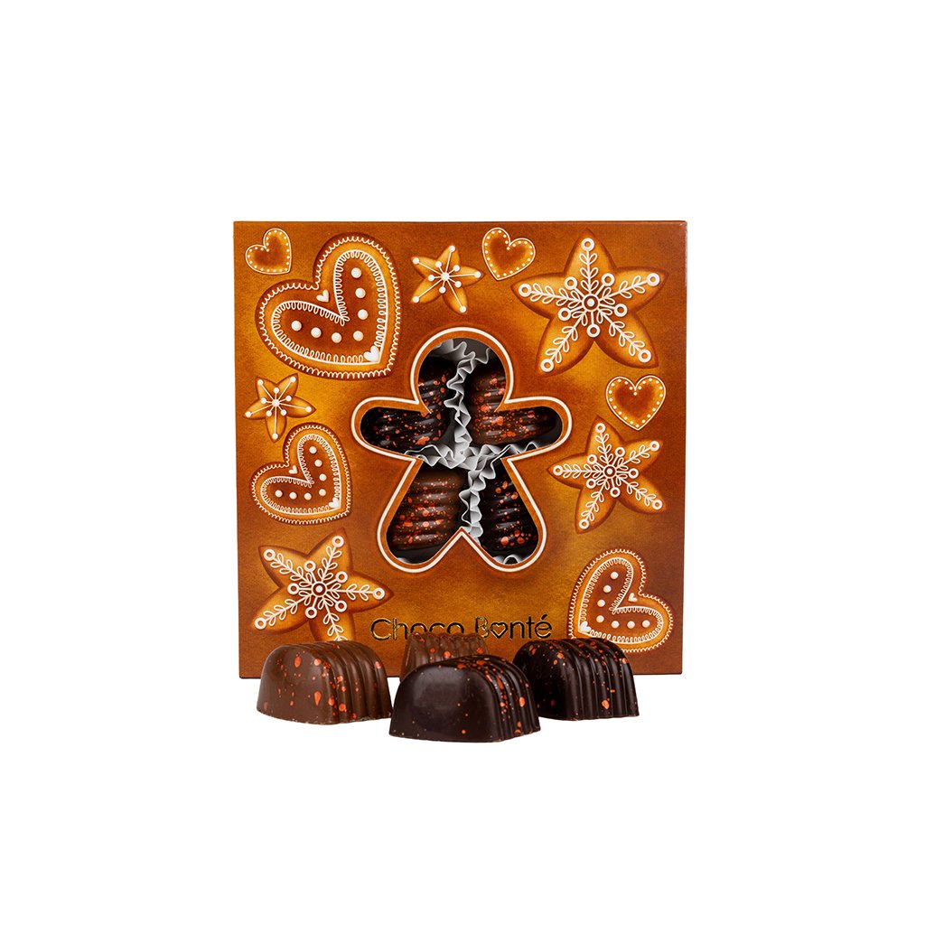 Uvnitř se ukrývají čtyři ručně vyráběné pralinky z kvalitní čokolády, provoněné perníkem a zimním kořením. Každý kousek je vytvořen s péčí a radostí.