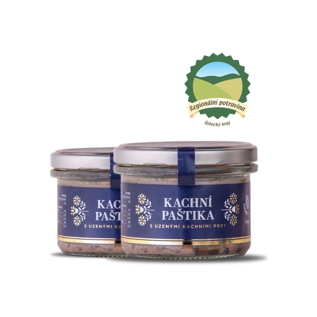 kachní maso min. 30 %, uzená kachní prsa min. 22 %, kachní játra min 22 %, kachní tuk, jedlá sůl, česnek, černý pepř