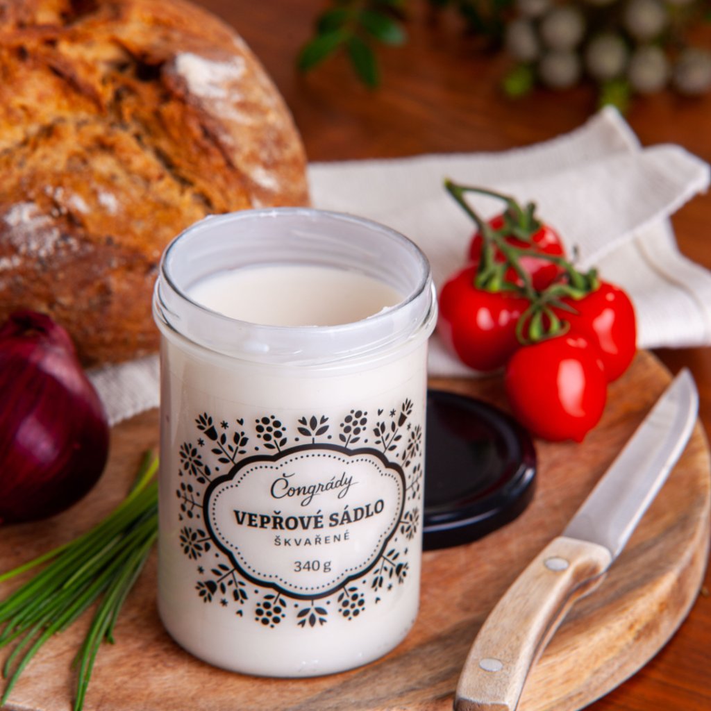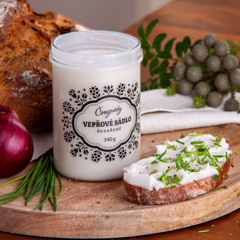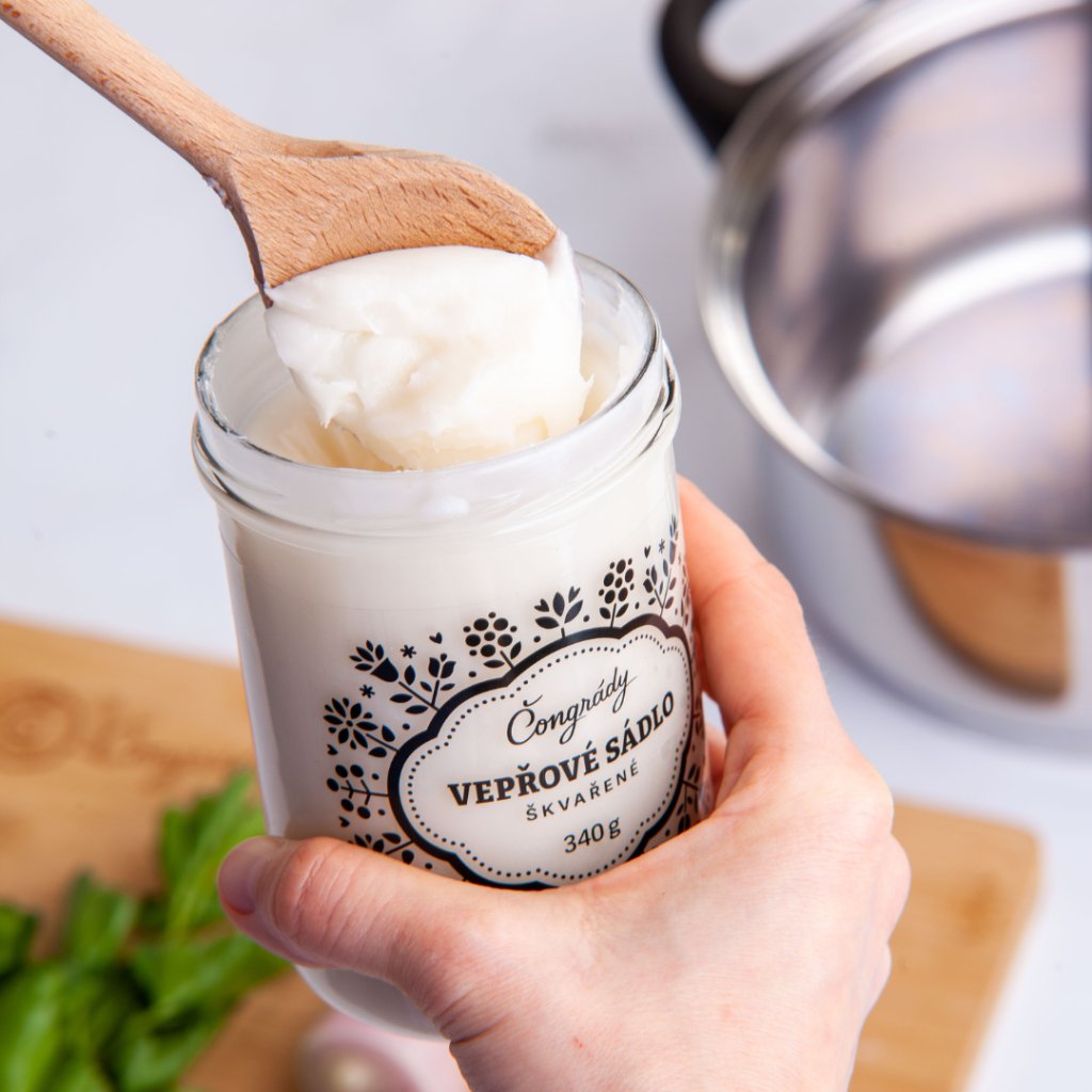 Naše vepřové sádlo je připraveno z prvotřídního vepřového tuku a šetrně škvařeno pro zachování jemné chuti a vůně.