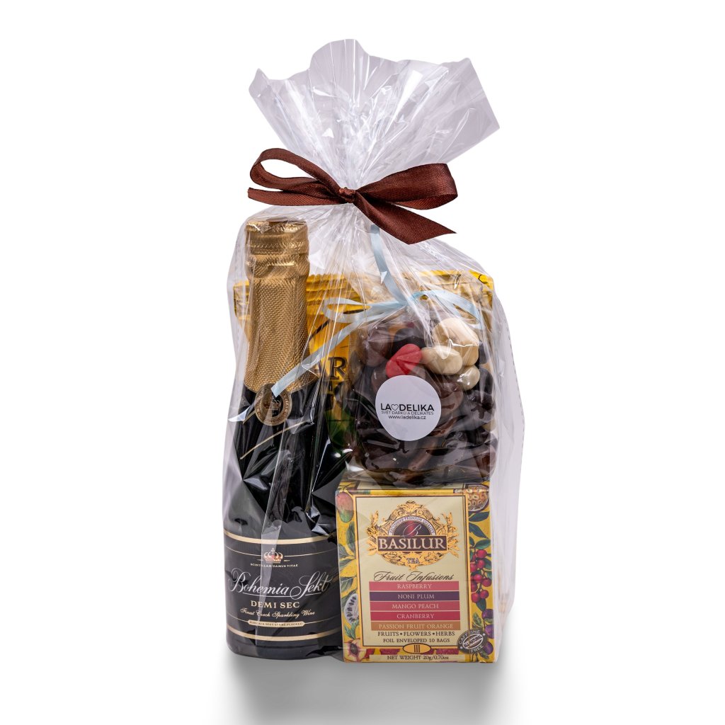 Objevte dokonalý dárek plný chutí a vůní. Tento elegantní dárkový set kombinuje jemně polosladký Bohemia Sekt Demi Sec 0,3 l, křupavý mix ořechů a ovoce v polevách 100 g, výběr ovocných čajů Basilur v pěti lahodných příchutích (2 ks od každé) a aromatickou mletou kávu Delikate 70 g (80 % Arabica, 20 % Robusta).