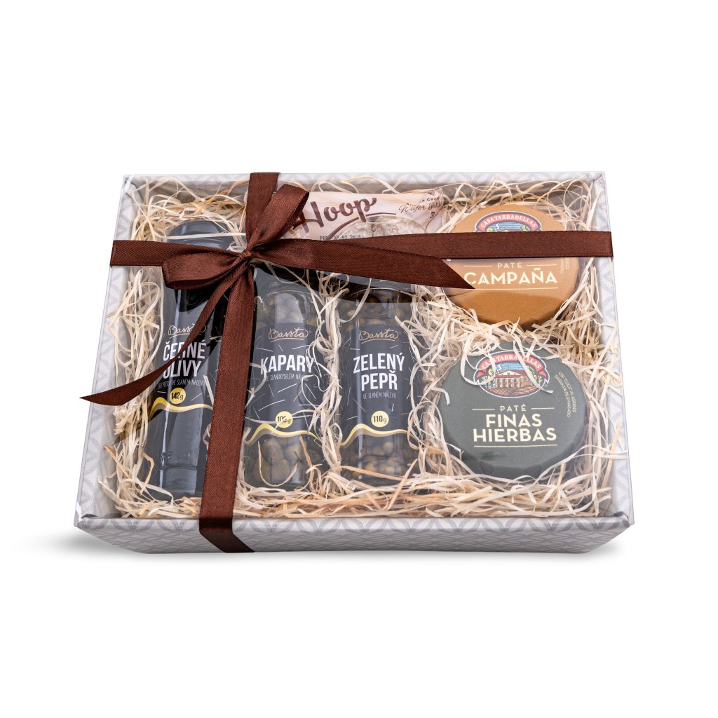 Darujte výjimečnou radost s dárkovým balíčkem plným středomořských chutí. Tento pečlivě sestavený mix delikates spojuje aromatické černé olivy, pikantní kapary, jemný zelený pepř, lahodná paté a sladkou tečku v podobě Raffaella – ideální kombinaci pro milovníky slaných i sladkých pochoutek.