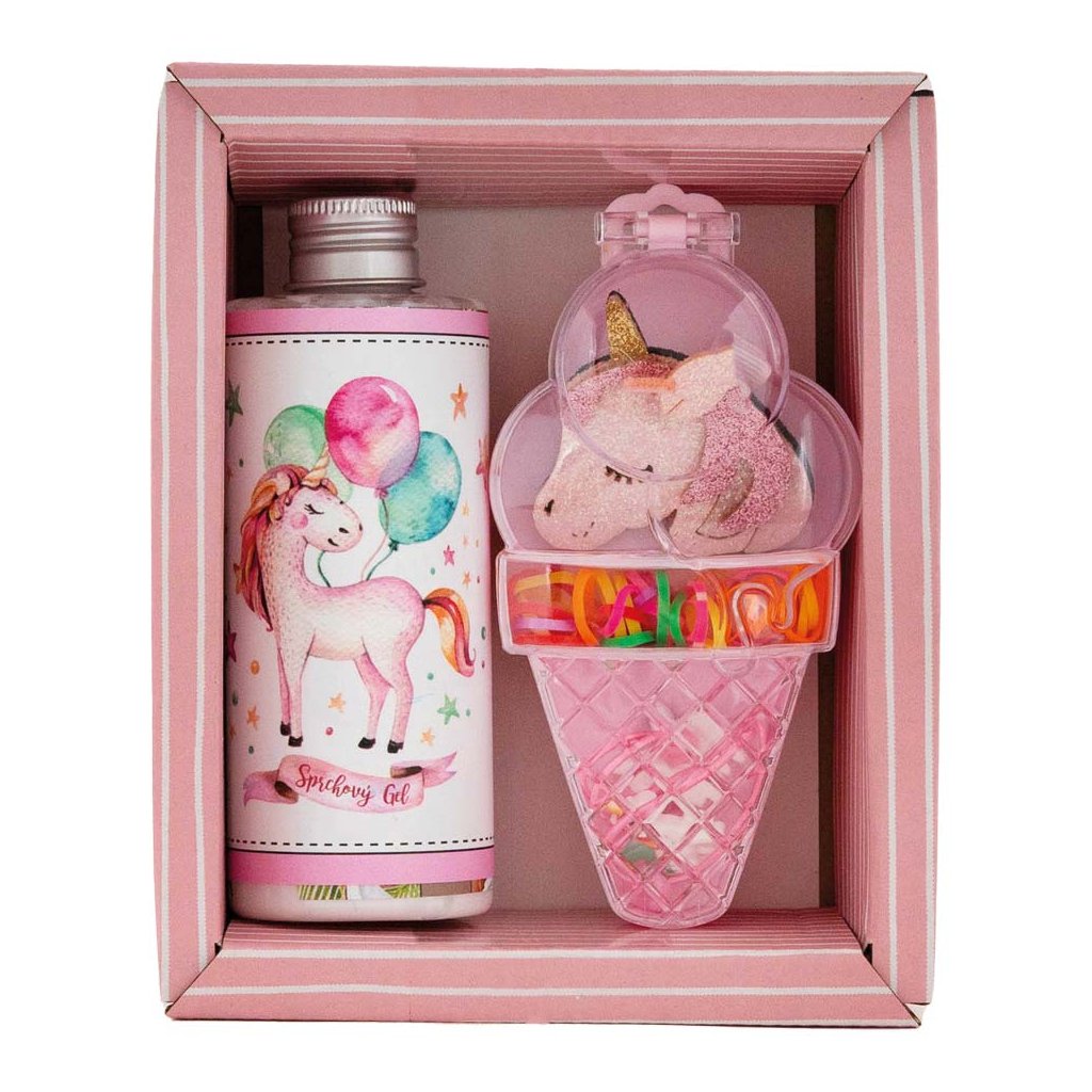Dětská kosmetická sada pro holky - sprchový gel 200 ml a sada gumiček do vlasů Jednorožec