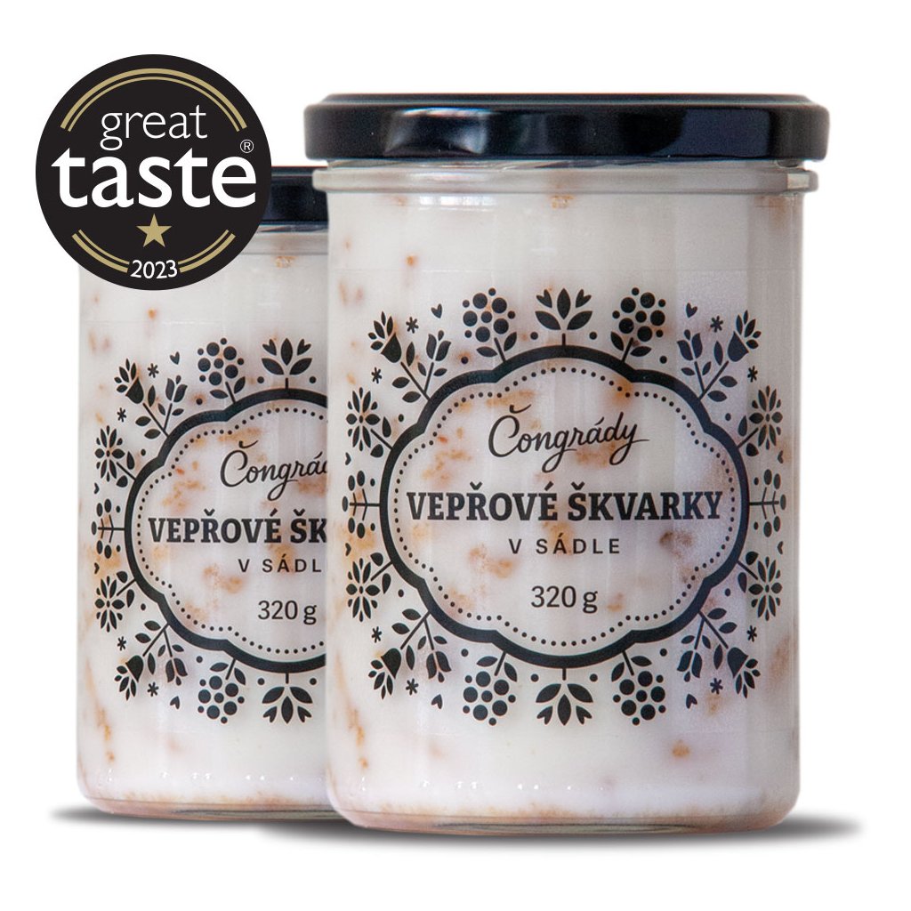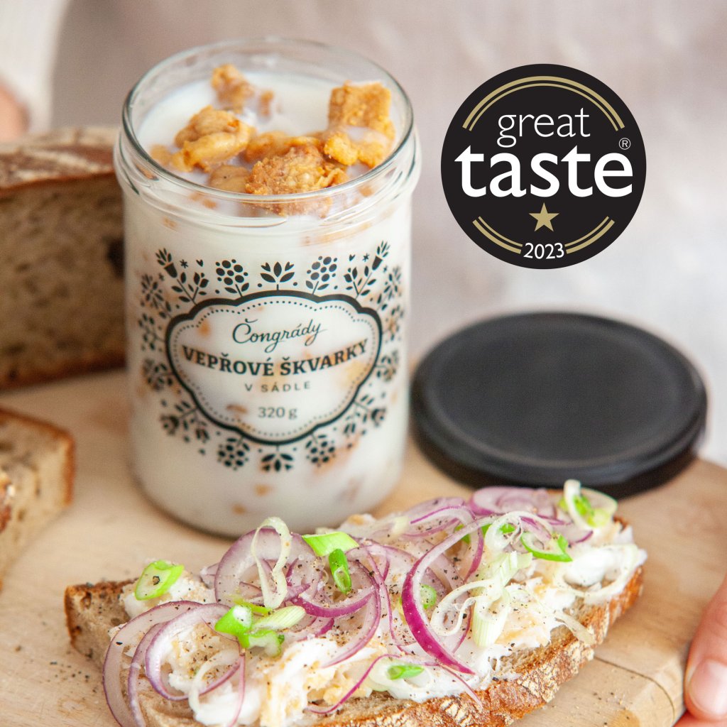 Naše vepřové škvarky získaly v roce 2023 prestižní ocenění Great Taste Awards, což potvrzuje jejich výjimečnou kvalitu.